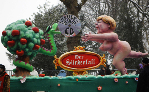 | المستشارة الالمانية انجيلا ميركل كما أظهرها كرنفال الماني وهي تتصارع مع المتهربين من الضرائب. |