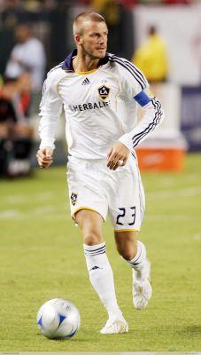 | بيكهام يجري بالكرة في مباراة لفريقه غالاكسي |