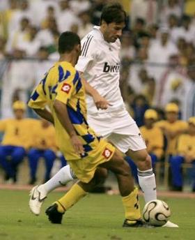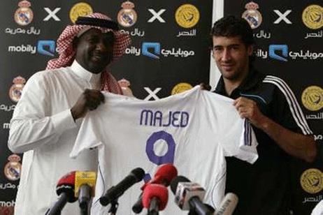 | ماجد عبدالله يتسلم من راؤول كابتن ريال مدريد قميص باسمه |