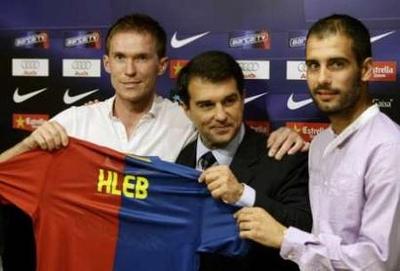 هيلب مع مدرب برشلونة ورئيسه لابورتا
