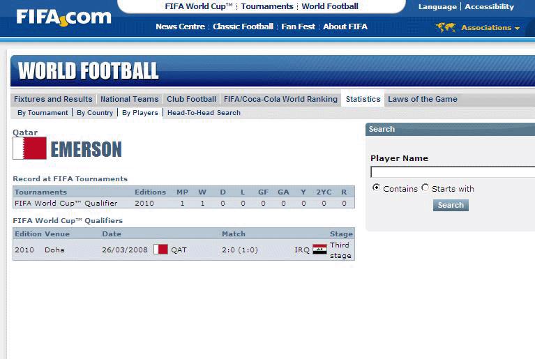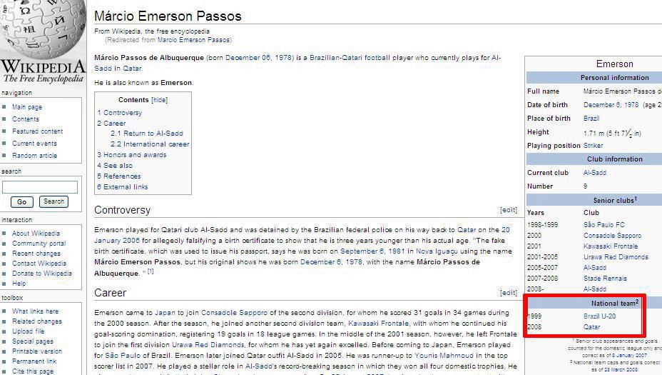 زيد بنيامين من دبي : لا تحتاج إلى الكثير من الجهد لتحصل على معلومات تكشف حقيقة ما يجري في قضية اللاعب القطري ايمرسون، فالرجل الذي ولد في السادس من ديسمبر 1978 قد مثل منتخب بلاده للشباب تحت عشرين عامًا في السابق وتحديدًا في عام 1999 ويبدو على انه ذو خبرة ودراية واسعة بأمور التزوير حيث سبق أن شارك مع منتخب الشباب البرازيلي تحت عشرين عامًا وكان عمره 18 عامًا بدل أن يكون 21 عامًا وهو عمره الحقيقي.