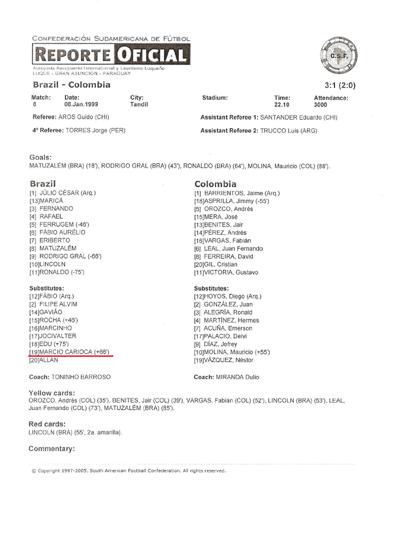 8 يناير 1999: البرازيل ndash; كولمبيا (3/1)