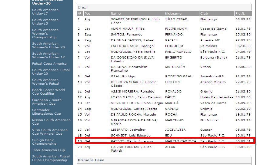 | صورة لموقع الاتحاد البرازيلي لكرة القدم يشير الى المنتخب المشارك في بطولة امريكا الجنوبية لمنتخبات الشباب تحت 20 عاماً في 1999 وتم الاشارة الى اسم ايمرسون الكامل واسمه الحركي (MARCIO CARIOCA) وقد ارتدى الفانيلة 19. |
