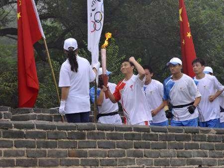 | احد حاملي الشعلة يمسك بها عند سور الصين |