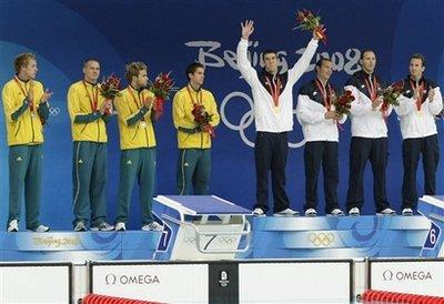 وهذا ما حدث، كان السباق كلاسيكيًا، ومشاركة السباح البالغ الـ23 من العمر كانت عظيمة وحاسمة. بطريقة فراشة تسلم السباح فيلبس السباق من زميله الذي كان في المركز الثالث بعد سباحة صدر رائعة من الياباني كوسيك كيتاجيما والاسترالي برينتون ريكارد. ومهما حصل، وبكل بساطة، اندفع فيلبس إلى الأمام بقوة لا تقاوم، مثلما فعل في انتصاراته الخمسة الفردية. وكان الفارق بينه وبين أقرب منافسيه ثلاثة أرباع الثانية وأصبح فوز فريق الولايات المتحدة بين يدي جيسون ليزاك، السباح الذي أبقى سجل فيلبس على الطريق الصحيح عندما فاز بالمرحلة الأخيرة من السباق مسجلاً رقماً عالمياً جديداً قدره 3.29.34 دقيقة.