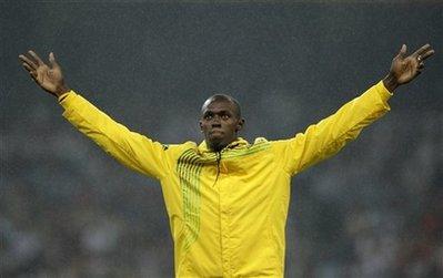 | بولت يحي الجماهير بعد فوزه بالذهبية |