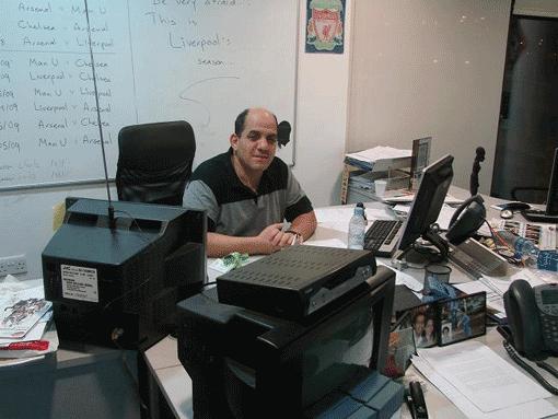 | الزميل خالد الغول أمام ملصق لنجوم الدوري الانكليزي |