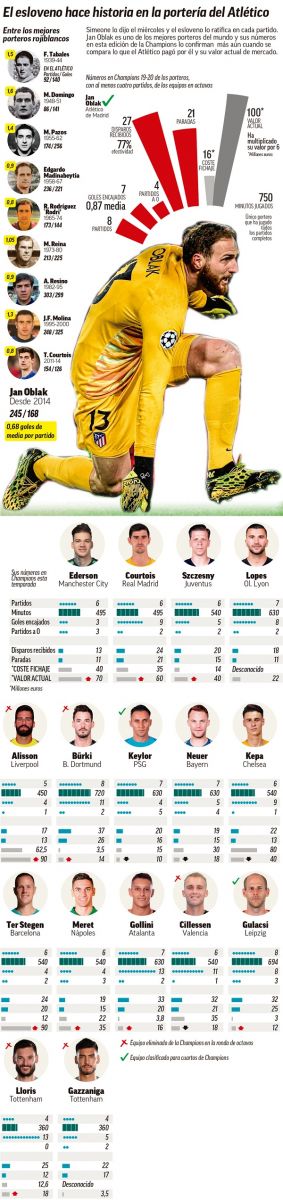 و بات واضحاً بأن نتائج أتلتيكو مدريد في بطولة دوري أبطال أوروبا هذا الموسم معلقة بحارسه اوبلاك، حيث تكشف ارقام نشرتها صحيفة "ماركا" الإسبانية بأن الحارس السلوفيني هو الافضل مقارنة بحراس بقية الأندية التي تجاوزت دور المجموعات ، متفوقاً بذلك على حراس كبار على غرار البلجيكي ثيبو كورتوا حارس ريال مدريد و الألمانيين مانويل نوير حارس بايرن ميونيخ و وتير شتيغن حارس برشلونة الإسباني و الكوستاريكي كايلور نافاس حارس باريس سان جيرمان الفرنسي.