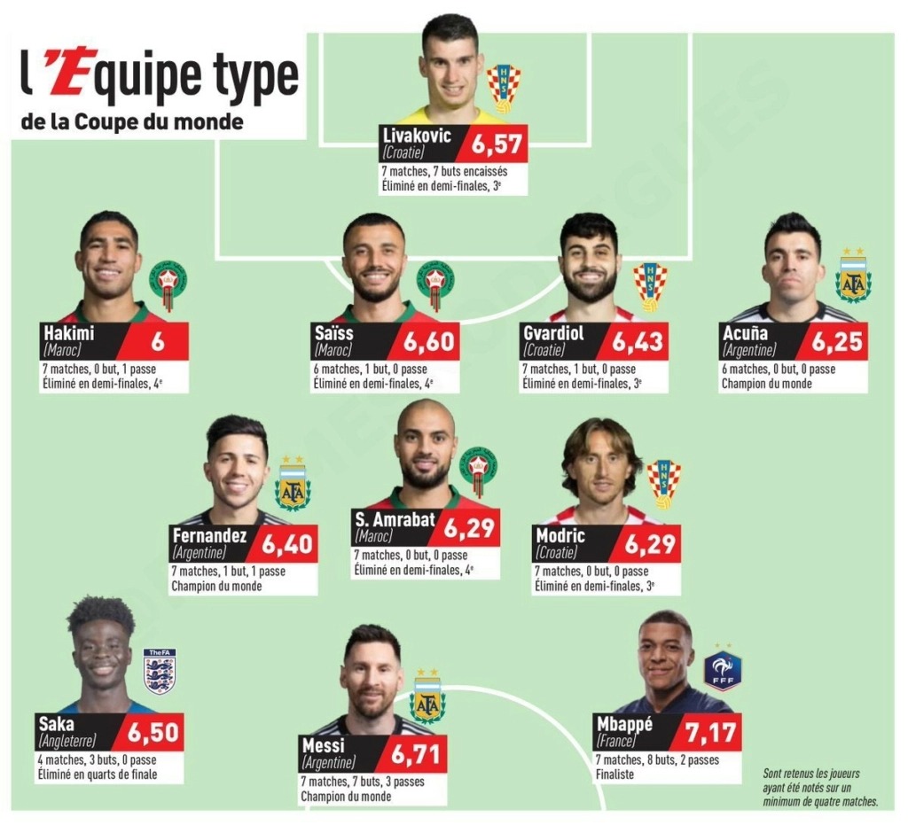 وبحسب اسلوب 4-3-3، تألف خط الهجوم المثالي من الأرجنتيني ليونيل ميسي والفرنسي كيليان مبابي والإنكليزي بوكايو ساكا، فيما تألف خط الوسط من المغربي سفيان امرابط، والكرواتي لوكا مودريتش ظهيراً أيسر، والأرجنتيني إنزو فيرنانديز ظهيراً أيمن.