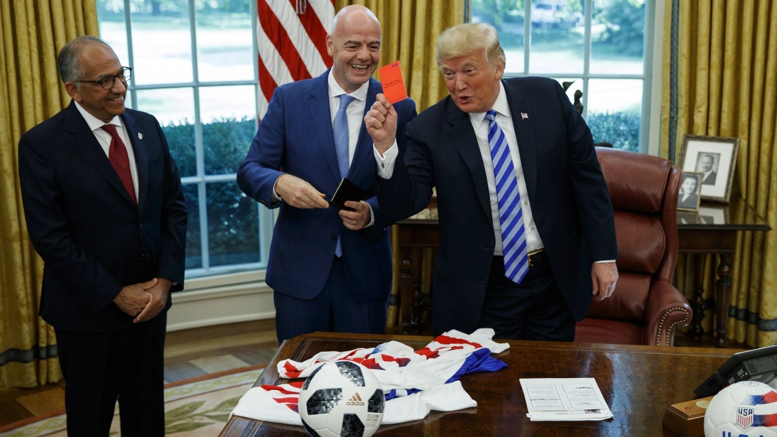 قام إنفانتينو بأول زيارة له إلى المكتب البيضاوي في عام 2018، برفقة رئيس الاتحاد الأميركي لكرة القدم كارلوس كورديرو. سلم إنفانتينو بطاقة حمراء لحكم كان ترامب يستمتع بإظهارها أمام الكاميرات، وقميصًا لكرة القدم يحمل الرقم 26 - على الرغم من أنه كان من غير المتصور آنذاك أن يكون ترامب في منصبه عند إقامة البطولة تحت أي ظرف من الظروف. لكن وجود مؤيد متحمس في البيت الأبيض سيكون مفيدًا خلال سنوات التحضير.