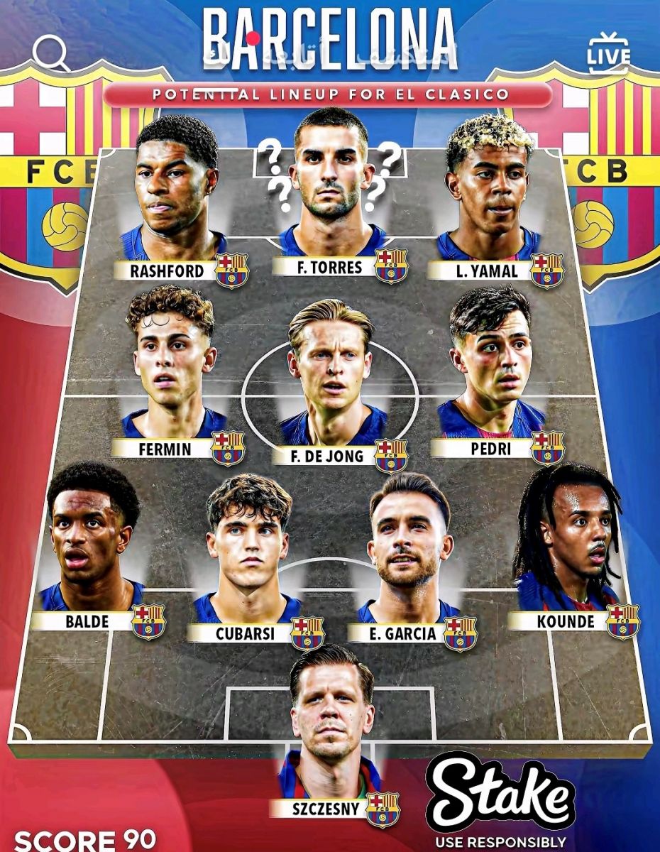 ولا تزال مشاركة المدافع الفرنسي جول كونديه، العائد إلى التدريبات السبت، والمهاجم فيران توريس غير مؤكدة.