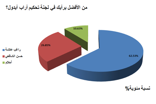 بيروت:ضمن إستفتاء صفحة فنون في إيلاف والذي إستمر على مدار أسبوعين قبل إنتهاء البرنامج، إختار القراء الفنان راغب علامة الأفضل من بين أعضاء لجنة تحكيم برنامج quot;محبوب العربquot; Arab Idol حيث حصد ما نسبته 62.53% ، وحل بعده الموزع الموسيقي حسن الشافعي بعد حصوله على ما نسبته 26.85% ، وحلت الفنانة أحلام في المركز الأخير بنسبة 10.64% من الأصوات.