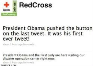 فخلال زيارة قام بها باراك أوباما لأحد مراكز الصليب الأحمر لدعم ضحايا زلزال هايتي، قام أحد أعضاء الفريق الإعلامي للمركز بتحديث مشاركاته عبر تويتر بالقول: quot;الرئيس الأميركي وزوجته يقومان بزيارة لمركز عملياتنا الآن.quot; ولاحقا طلب الموظف من الرئيس أوباما تحديث الصفحة بنفسه، بضغط زر quot;التحديثquot; على تويتر، لتنشر الرسالة مرة أخرى على مجموعة الصليب الأحمر.