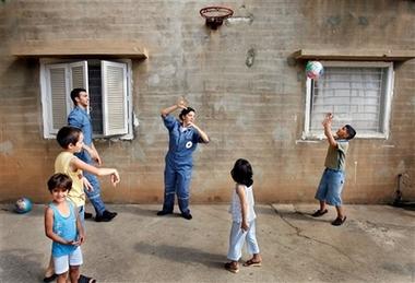 | أطفال لبنانيون يلعبون كرة السلة مع أفراد من الصليب الأحمر |