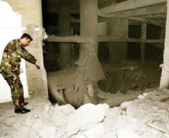 | الخسائر بدت جسيمة: اعمدة مشققة واسقف منهارة وزجاج مكسر وجدران محترقة |
